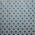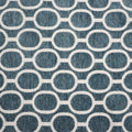 Teal Link Geometric Comersan Col.65 Fabric features a structured interlocking oval pattern arranged in a clean, repeating grid. The rich teal tone is set against a soft ivory background, creating a crisp contrast that highlights the geometric link design. The evenly spaced oval motifs form a subtle lattice effect, giving the fabric a modern, tailored appearance while maintaining visual softness through its textured finish. The balanced scale of the pattern allows it to feel bold yet refined.