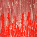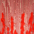 This Red Feather & Sequin Stripe Embroidered Lace is a bold and captivating fabric designed to command attention. Set on a delicate nude mesh, it features radiant vertical lines of red sequins and micro-beads that create a dazzling linear shimmer. The lower section is richly adorned with soft red feathers, adding dramatic texture, movement, and a couture-inspired finish.