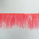 Ostrich Fringe is made with the fibers/tendrils from ostrich feathers and sewn on a bias tape. The fibers are light and fluffy and have an elegant flow. The fibers are 5-6 inches long and our fringe is sold by the yard. Some examples of uses are: Maxi Skirts, Millinery, Costumes and other feather fashion!