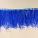 Ostrich Fringe is made with the fibers/tendrils from ostrich feathers and sewn on a bias tape. The fibers are light and fluffy and have an elegant flow. The fibers are 5-6 inches long and our fringe is sold by the yard. Some examples of uses are: Maxi Skirts, Millinery, Costumes and other feather fashion!