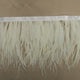 Ostrich Fringe is made with the fibers/tendrils from ostrich feathers and sewn on a bias tape. The fibers are light and fluffy and have an elegant flow. The fibers are 5-6 inches long and our fringe is sold by the yard. Some examples of uses are: Maxi Skirts, Millinery, Costumes and other feather fashion!