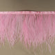 Ostrich Fringe is made with the fibers/tendrils from ostrich feathers and sewn on a bias tape. The fibers are light and fluffy and have an elegant flow. The fibers are 5-6 inches long and our fringe is sold by the yard. Some examples of uses are: Maxi Skirts, Millinery, Costumes and other feather fashion!