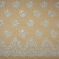The Silver Scrollwork Embroidered Lace Fabric is a statement of timeless grace and couture precision. Embroidered on a lustrous silver tulle base, it features intricate floral clusters framed by ornate scroll motifs, arranged in a balanced and rhythmic composition. The bottom edge is adorned with a grand scalloped border, meticulously detailed with floral medallions and lattice accents, creating a rich and dimensional aesthetic.