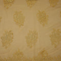 Radiating elegance and luxury, the Metallic Gold Vine Motif Embroidered Lace Fabric features delicate vine-inspired floral appliqués embroidered in gleaming gold thread across a soft, sheer beige mesh. The motifs are evenly spaced, forming a graceful, repeating pattern that catches and reflects light beautifully, creating an opulent yet refined aesthetic.